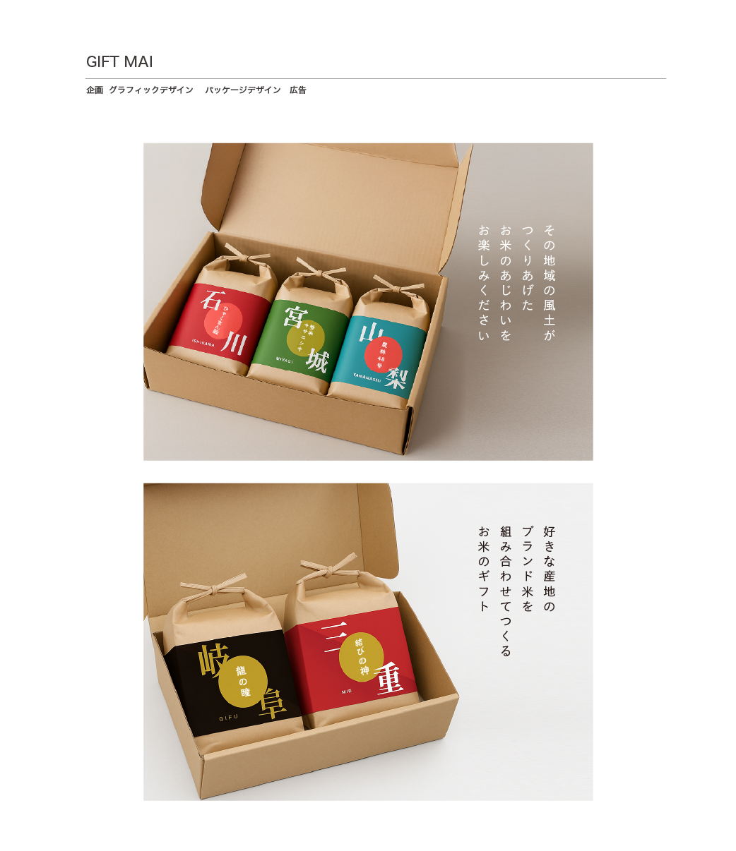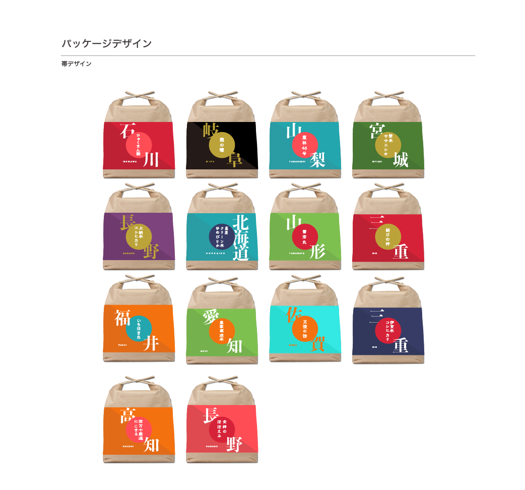 産地の名前を全面に押し出したデザイン。全国各地のブランド米を詰め合わせるギフト用パッケージ